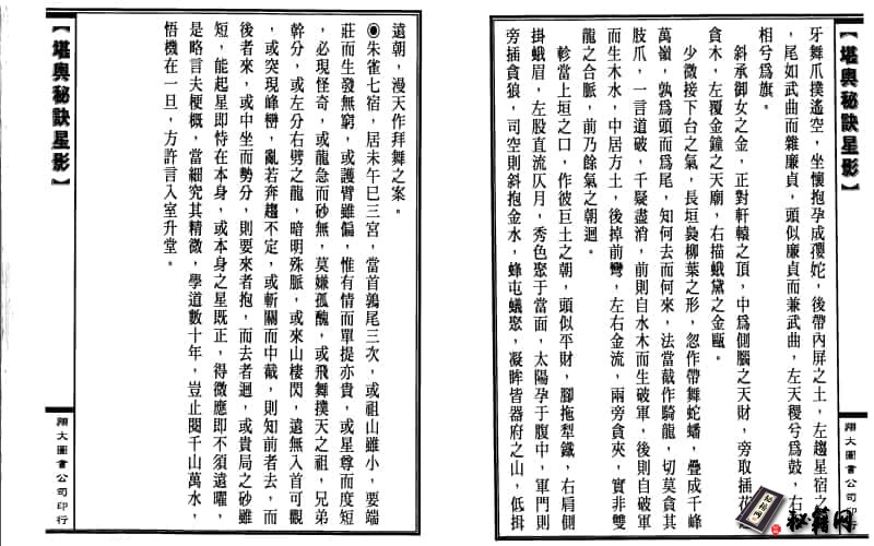 方之座,山有金木水火土之分,观弯环勾折之势,即摆舞动摇之态,断而复续,过峡何疑,东而覆展,胎息可见,团盖如防水劫,张弓似畏风吹,星余玉辰,山连流退而水止,星横艰漠,山能波海而穿江。星之有名者,三百八十三座,共一千四百六十四星,其微而无名者,尚有一万二千五百二十漏。山之辑撒者五,裤洞天者三十六,裤福地者七十二,有名者五千三百七十,其无名者,不知几千万亿兆焉,至於沃野平畴皆分星体,澄源巨港亦秉星形,平阡则力更厚於高峰,水神则秀加灵於山气,是编也语无锦囊,岂聘吾之娇说哉?意绝雷同,亦欲言所独得耳?无论大局大坦,始符星象,即或一勾一搭:亦类星形,倘少变化之方,必致误用之弊,惟愿知音哲匠,嗤为了不异人,不求玄术俗巫,亦欲强作解事,靖据言辞之所及,可明意旨之所归,世或斥为迁谈,君姑勉为妄听