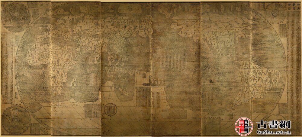 此《坤舆万国全图》由意大利传教士利玛窦与李之藻合作而成。全图共六幅条屏,其内容大致分作三部分:主图是椭圆形的世界地图、四个角的天文图和地理图以及题跋解释说明的文字。这是中国第一幅完整的经纬世界地图。此内含明万历三十年原刻本,朝鲜、日本后摹本共六幅。