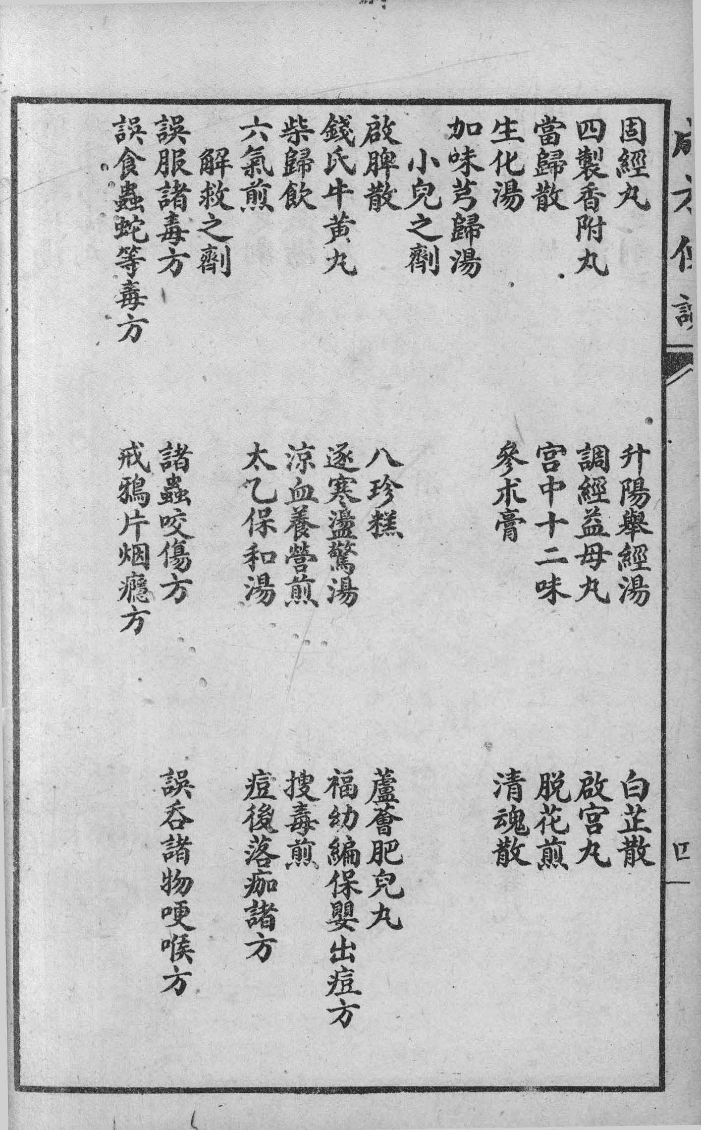 各方之下,间有附方,均於前目录中一概标出,附於本方之下,使学者读之便知有加减出入之妙。