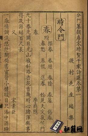 此书前无书名叶,无序跋。开卷即目录。正文卷端题:分門纂類唐宋時賢千家詩選卷第一,下署:後村先生編集