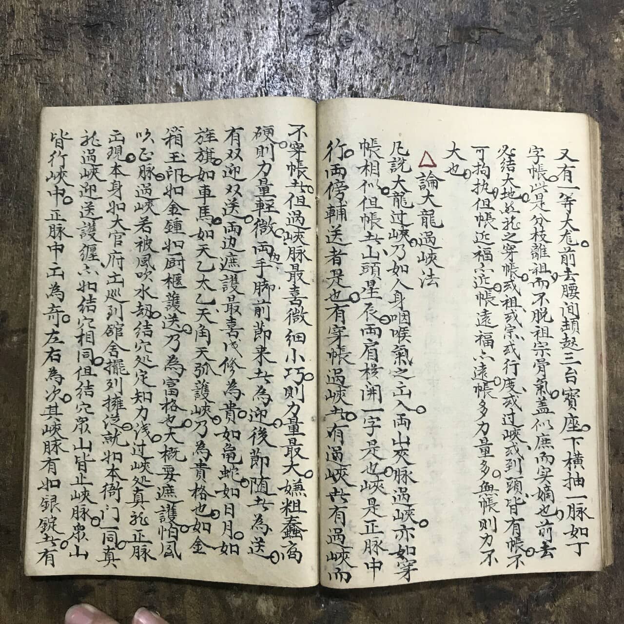 又教汝等剿龙法,剿龙考卜地之法也,剿龙何如,不必登髙山顶上,寻脉望势,若有一条大路横穿过去,八jiu枝山,腰中间必有一枝是正龙,尔等行到此路,心中摹想,或自左过右,先看脚下左山有枝脚无校脚否,看水向那一边湾,山向那一边会,如此是𣷸山,却再走一两枝也是如此,皆为𣷸山,倘见那一枝山脚占得地方多,两边山皆来会,两边水皆来抱,此一是正龙,必结大地,若眾山皆无枝脚,则以有枝脚考為正龙,众山皆枝脚,则以布势自行,不顾他山,不做用神考為正龙耳,此是论龙之枝脚,若论正龙山脊自起伏活动,不与他山硬直粗蠢考相同,所谓踏着龙神心裹惊,今后尔等见此山,认得那一枝是龙,或往后去步,或向前去寻穴,此剿龙寻脉诀。