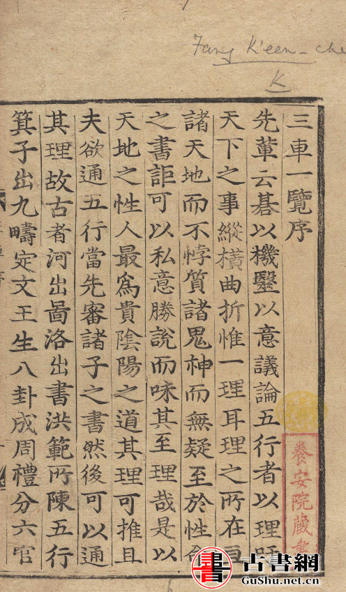 三车一览命书详论,书内又题《新刊严陵先生三车一览》、《严陵方氏三车一览》,序中又名《三车一览五行纪源》。【宋】方谦之编。十卷六十九章。线装三册。【南宋】景定二年辛酉(一二六一)序。疑朝鲜李朝翻刻本。
