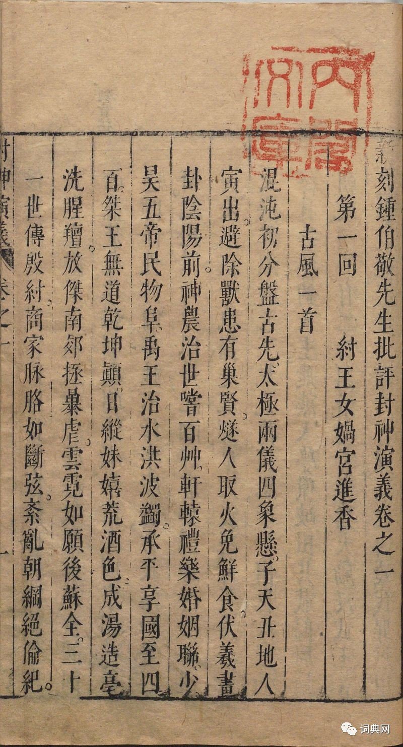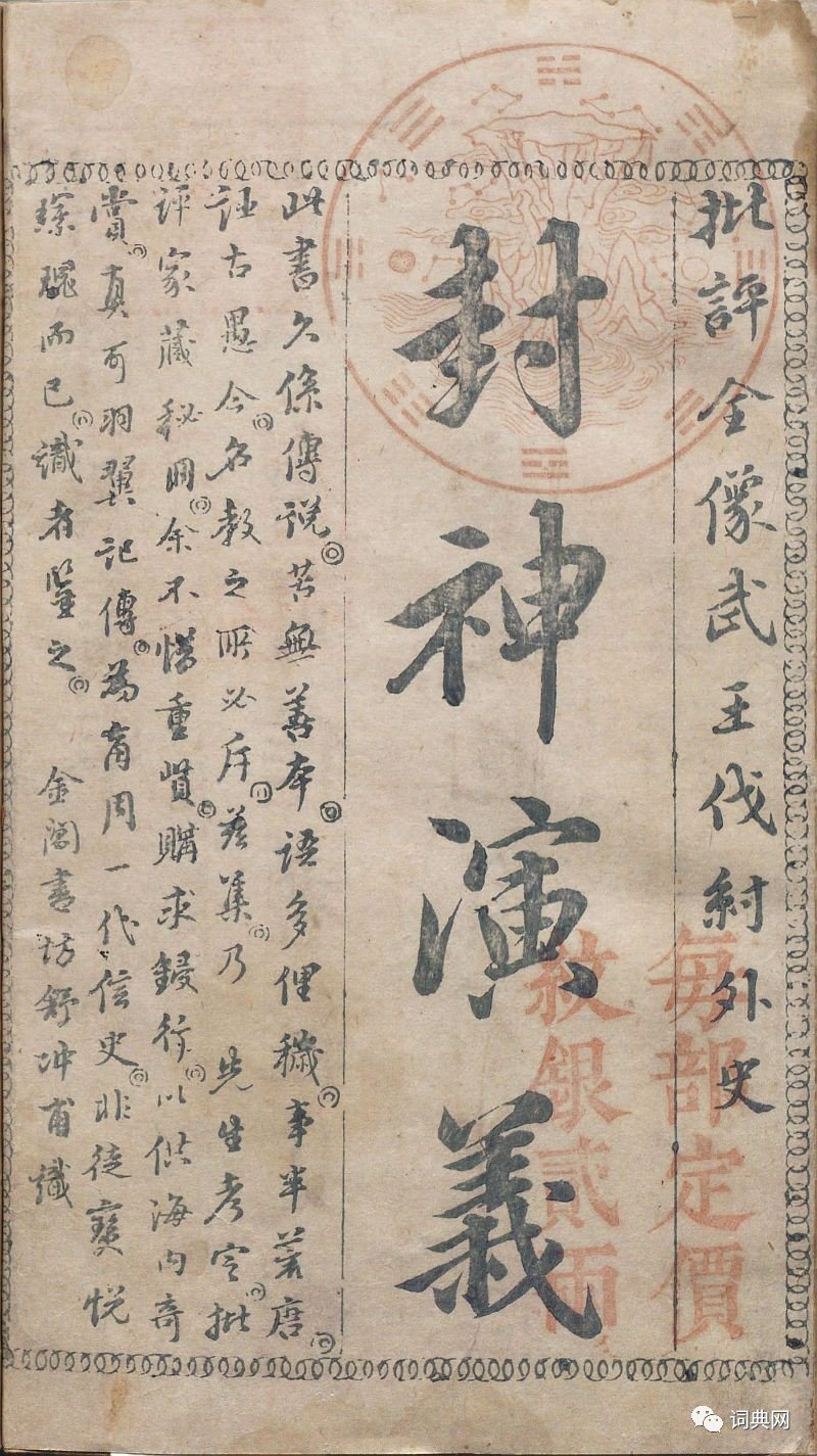 《封神演义》俗称《封神榜》是一部中国古代神魔小说,为明代许仲琳所作。全书共一百回,内容演述商末政治纷乱和武王伐纣的历史故事,颇多仙佛神魔斗法的描写,富于神话色彩。此《新刻钟伯敬先生批评封神演义》为明万历时期舒文渊刻本。