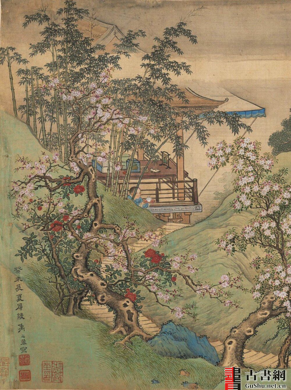平台上安坐者为康熙二十七年进士的史申义(一字蕉饮)。其周围春花繁盛,诸如白玉兰、桃花、梨花等与修竹俯仰环绕,水面又有蓝鹊结伴飞舞,清气穿插于树梢间,生意盎然又清雅悠然。(介绍参考)