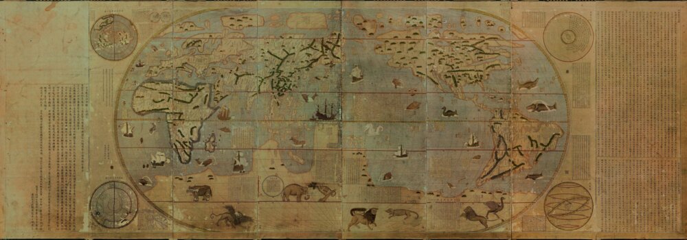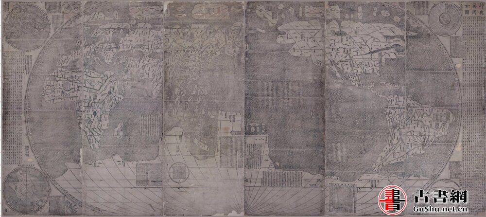 此《坤舆万国全图》由意大利传教士利玛窦与李之藻合作而成。全图共六幅条屏,其内容大致分作三部分:主图是椭圆形的世界地图、四个角的天文图和地理图以及题跋解释说明的文字。这是中国第一幅完整的经纬世界地图。此内含明万历三十年原刻本,朝鲜、日本后摹本共六幅。