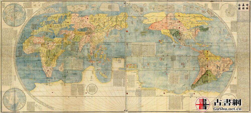 明神宗万历十二年(1584 年),意大利来华传教士利玛窦到达广东肇庆,编制《山海舆地全图》,由王绊首刻于肇庆。万历二十九年(1601 年),利玛窦抵京师献图,深受明神宗喜爱。此图后经多次重绘,最后于明万历三十年(1602 年),由太仆寺少卿李之藻出资刊行,刻印于北京,改曰《坤舆万国全图》。万历三十六年(1608 年),明神宗下诏摹绘十二份,传于现世,原本可能随葬明定陵。《坤舆万国全图》原为六幅,后来装裱为一幅。此图在地理学和制图学界具有重要位置。经多次翻印摹抄,影响深远。
