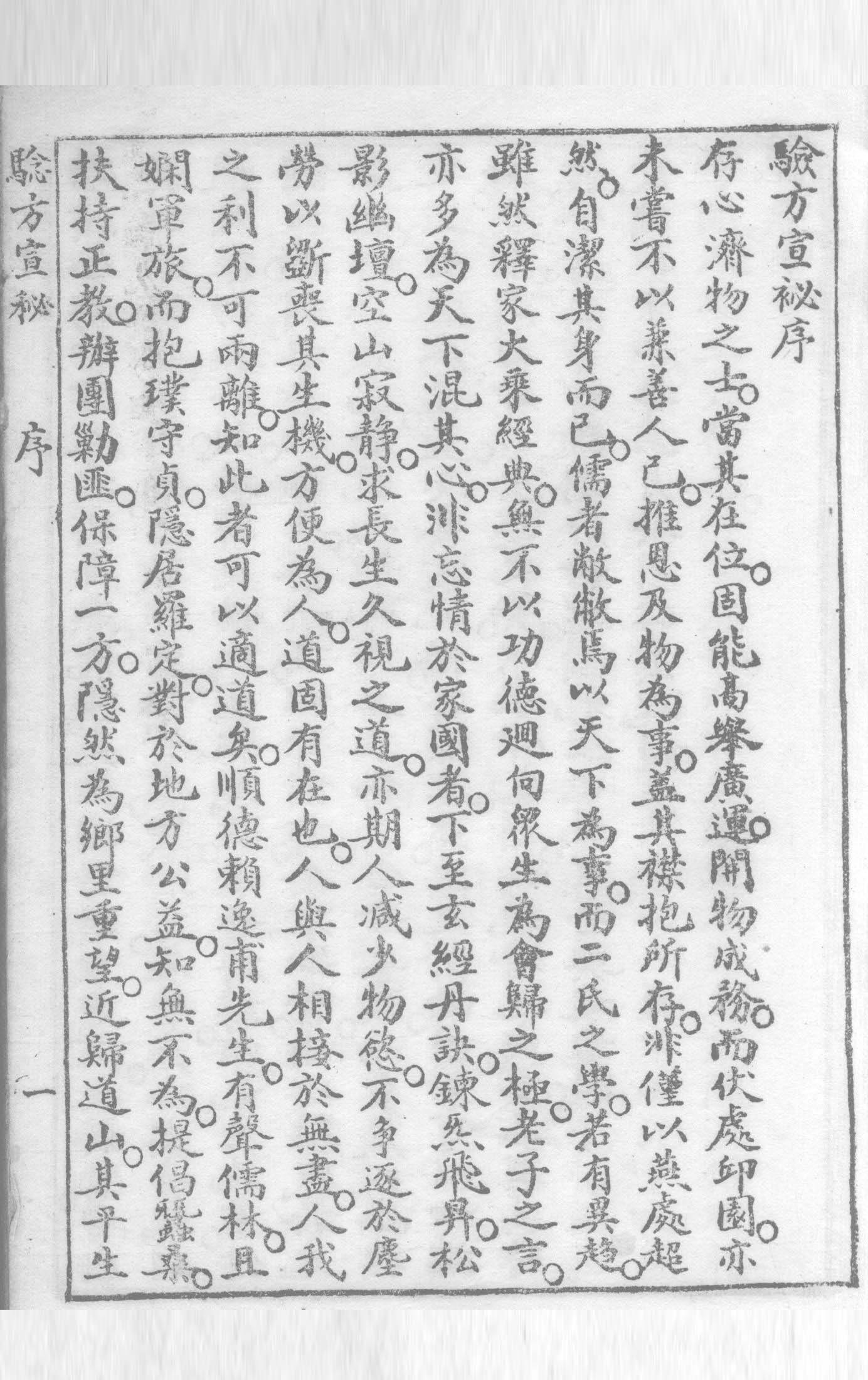 尝闻人之立身行己,居家处世,非有定识定力,难免不随流俗所转,予幼读家谱,获諦,始迁祖布衣公,尝语人以人生不必泥于仕宦為功业,凡有可以济人利物者,即皆功业云,予由是猛然觉悟而择是替非,凡值喫亏受屈之境,予以偿诸前生怨债而设想之,凡刀缴幸便宜之遇,于以他日循环所及而情虑之,矢积善自可光前裕后之志,而厌奋要利禄以扬名显亲之心,人之肴諛说以资谈柄,予则宣果报讲善书而适之,移弥月所浪费者為育婴放生之举,哀寿诞所虚糜者為矜孤恤寡之用,先消婚嫁之奢而多教读,力裁忌辰之宴以修坟塋,愤使臧获之所需以置边室,减捐赛会之资财而助账济,有学游艺之能宝学风水,有建花园之力务建宗祠,手泽先芬,校玩器而尤宝,寿文行状,当字画以益珍,矧予见人惟灾遘患,因病咨嗟,恨不得有以给其所求,而即脱其所苦,奈乎迷于流俗之徒,每每居奇医方以图射利,贫乏者力难满其所欲,虽求之甚殷,其终残忍漠视,甚矣,故作危言,询吓病者,勒券索谢,然乃用药,予见闻及此,輒等芒刺在身,又是奋心孤注,而搜牢居奇者所祕之著名验方,以期方便于世,而补官方之所未及,凡诸立法未纯,或他方出乎其右,或方虽应効,但其间微有流樊未臻尽美者,于皆宁缺毋滥,是恐虚延时日,怜之适以累之也,于自裳笔以谋菽水,樄檖数省,凡访闻及者,无不殚力购求,凡搜牢获者,无不广行传布,二十年间,征获内外验方二百余条,辑为二册,名曰验方宣秘,见之觉乎平淡无奇者,亦皆屡奏奇功,虽处万死一生之候,按法施治,无不起死回生,屡试屡验欲付手民以公诸世,自惭殄殄未逮,故傍傍然以待将来,但而今而后,获此方者,视奇货可居,勿随流俗所转,惟愿遏人欲而循天理,去繁文以务实济,盖己能利济于人,天方利济于己,己如刻薄,天亦寡恩,定此识力而尽济人利物之心,未必不无少効焉。