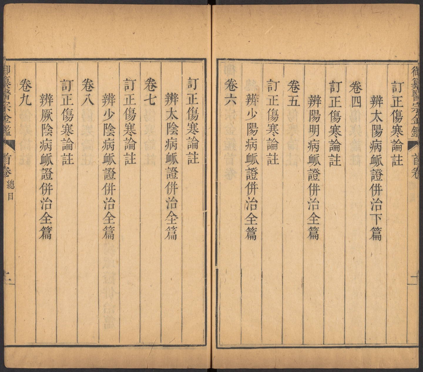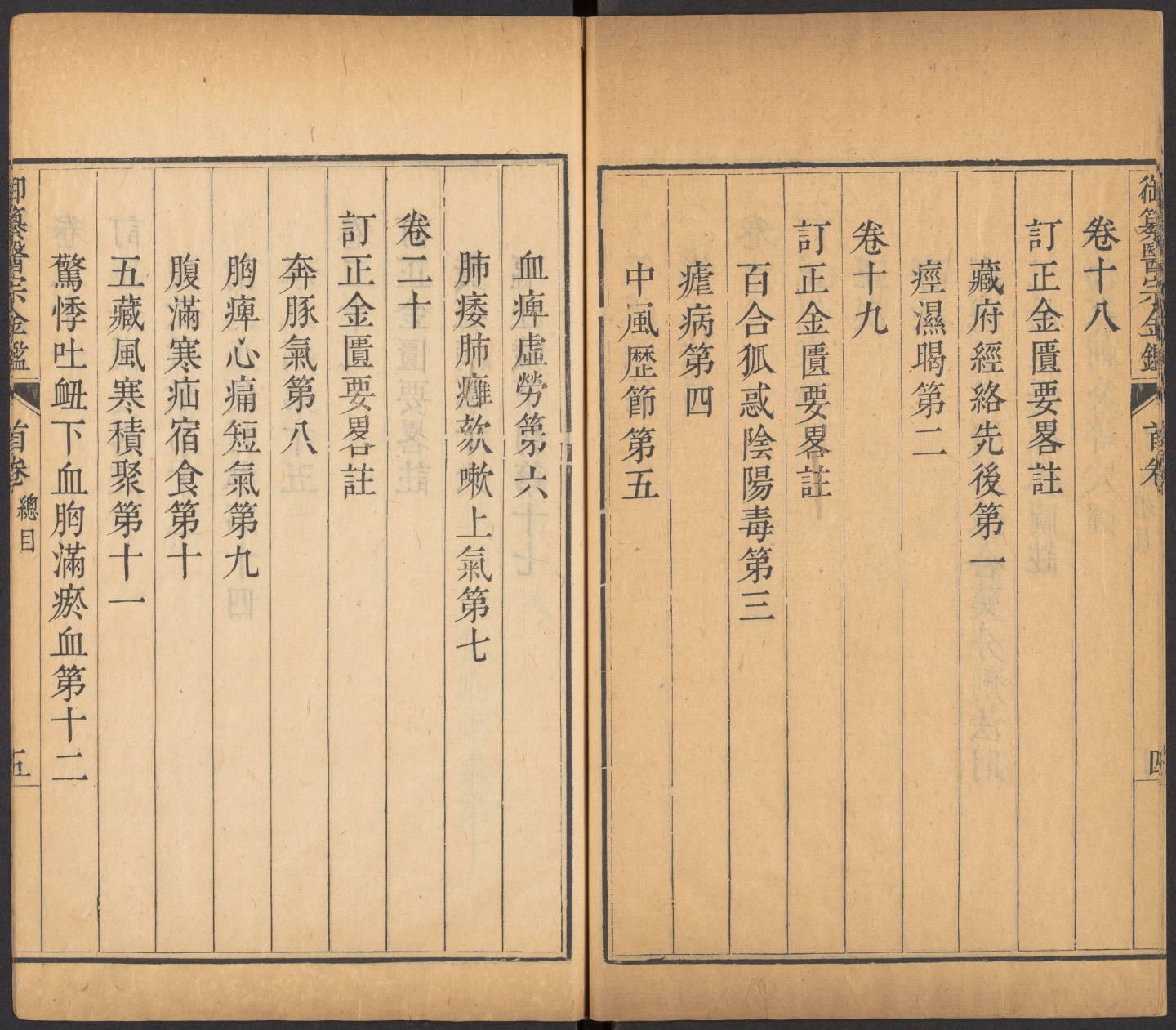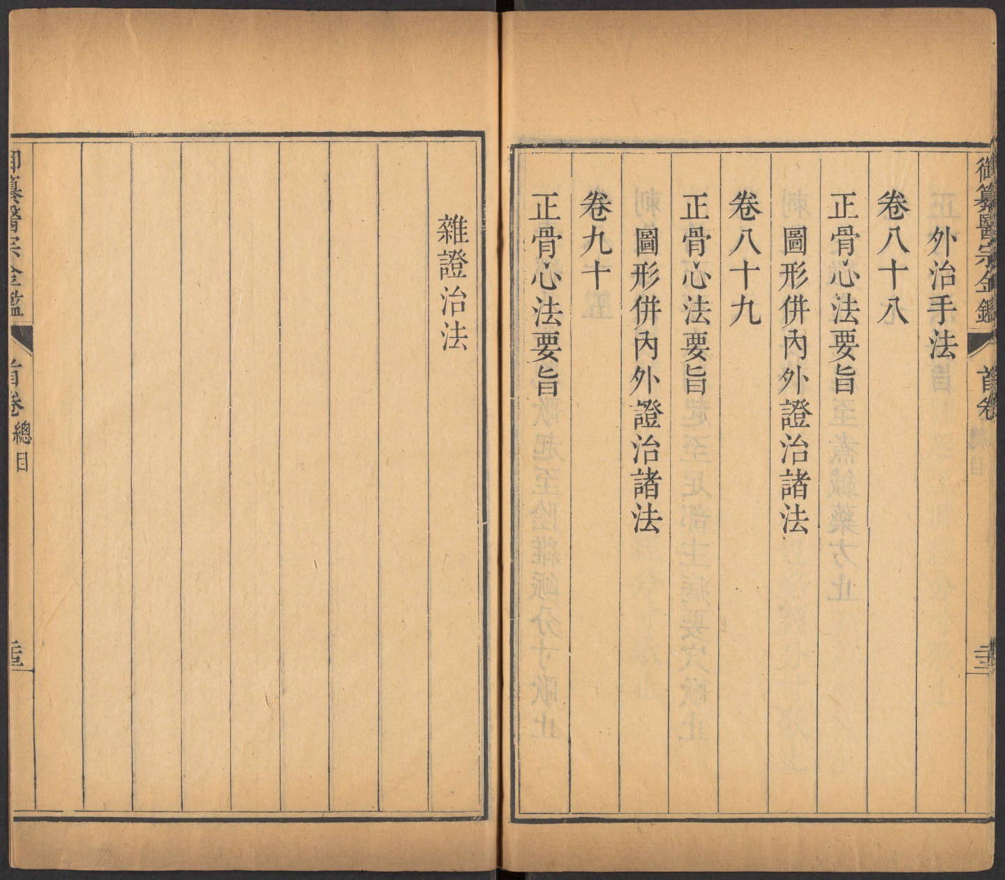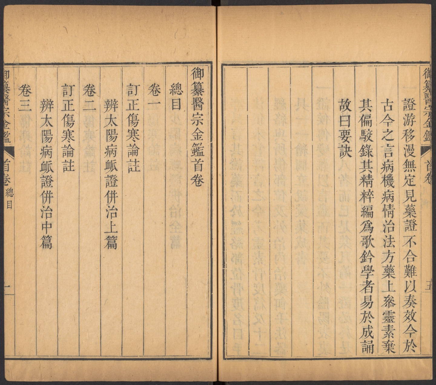 《御纂医宗金鉴》总九十卷,清吴谦等编纂,清乾隆七年武英殿刻本。内容依次为《订正伤寒论注》《订正金匮要略注》《删补名医方论》《四诊要诀》《运气要诀》《伤寒心法要诀》《杂病心法要诀》《妇科心法要诀》《幼科心法要诀》《痘疹心法要诀》《种痘心法要旨》《外科心法要诀》《眼科心法要诀》《刺灸心法要诀》《正骨心法要旨》。