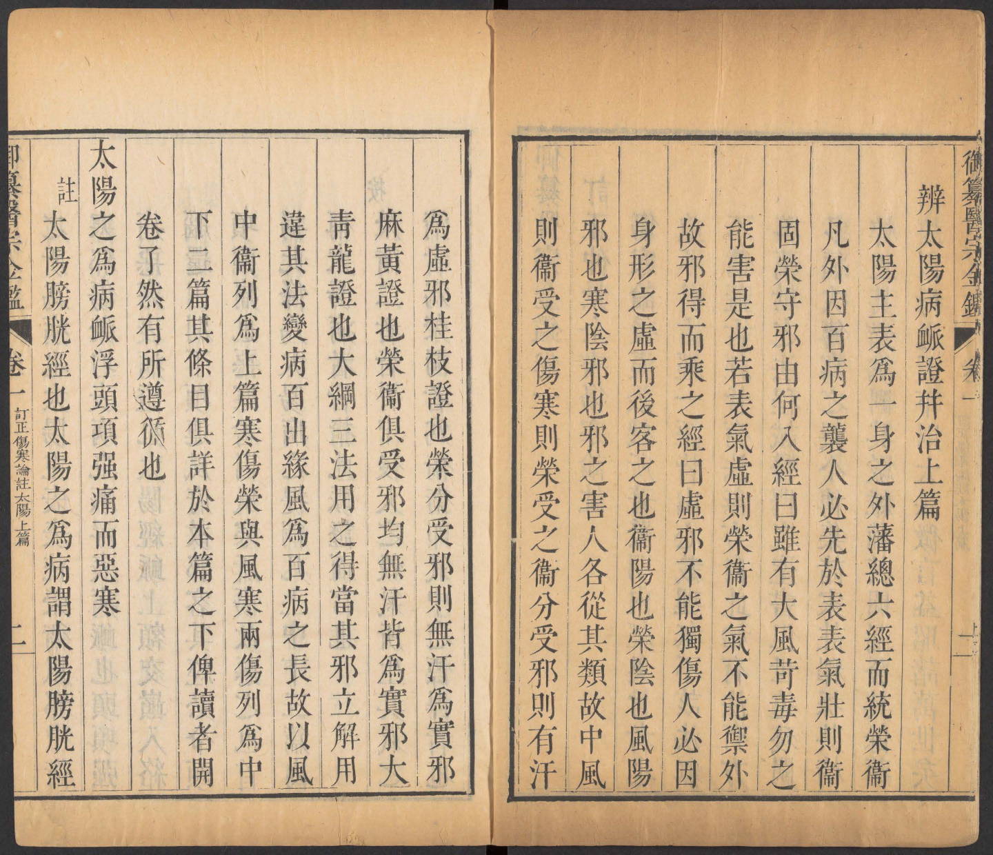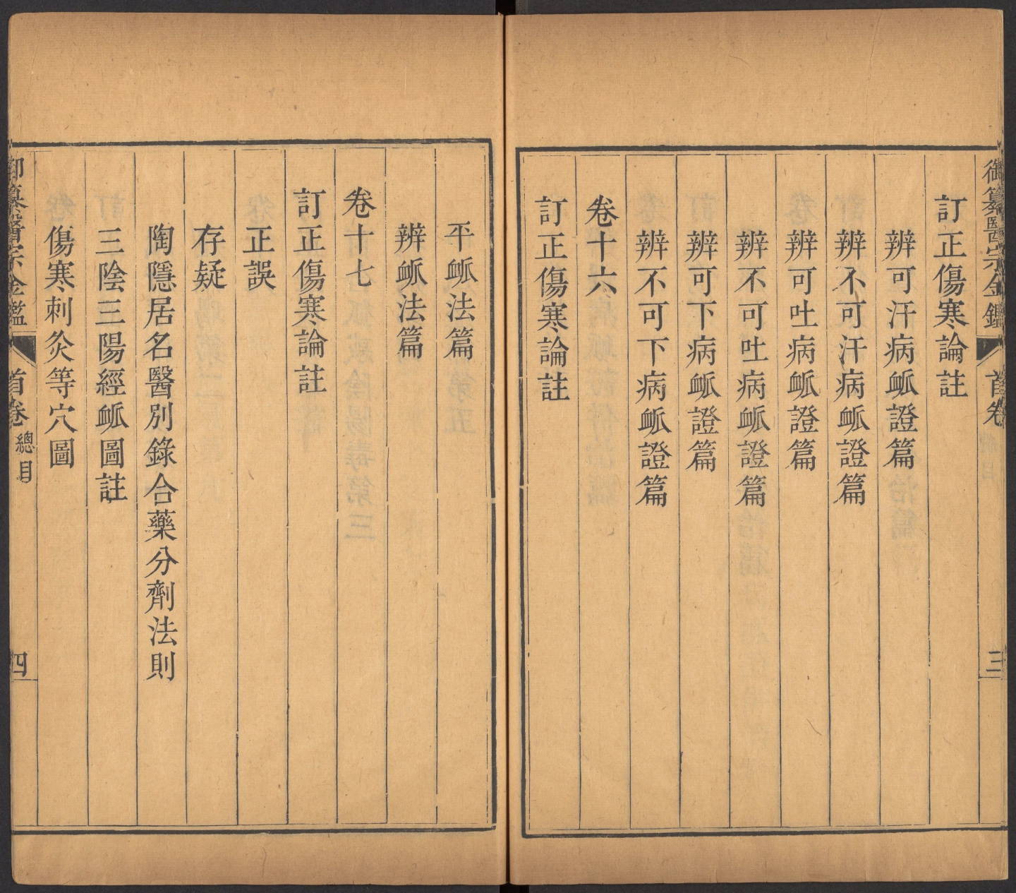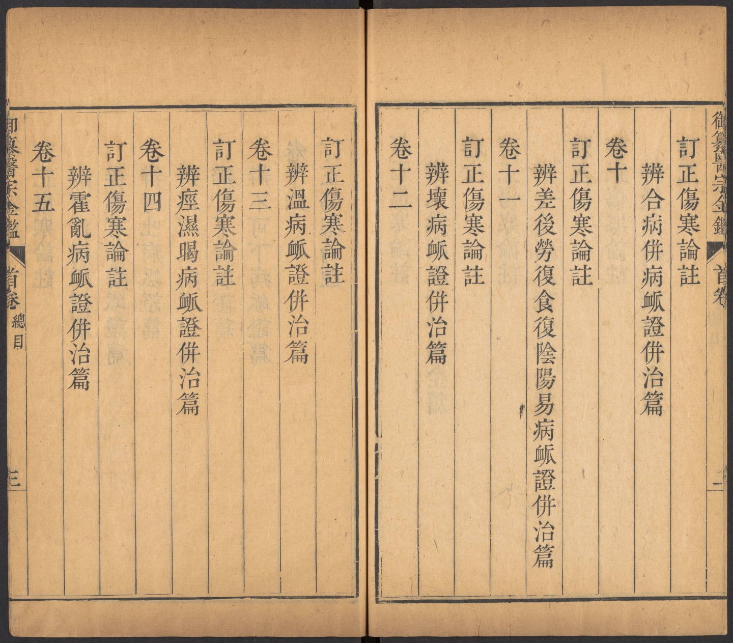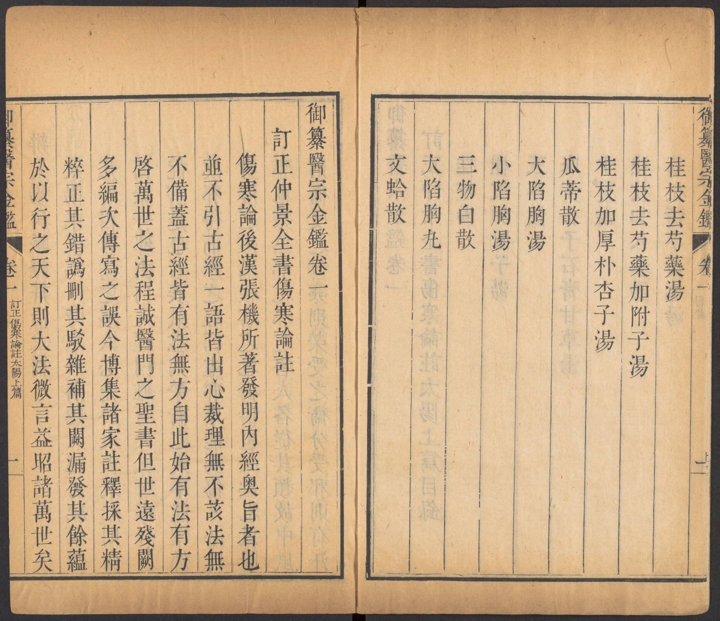《御纂医宗金鉴》总九十卷,清吴谦等编纂,清乾隆七年武英殿刻本。内容依次为《订正伤寒论注》《订正金匮要略注》《删补名医方论》《四诊要诀》《运气要诀》《伤寒心法要诀》《杂病心法要诀》《妇科心法要诀》《幼科心法要诀》《痘疹心法要诀》《种痘心法要旨》《外科心法要诀》《眼科心法要诀》《刺灸心法要诀》《正骨心法要旨》。