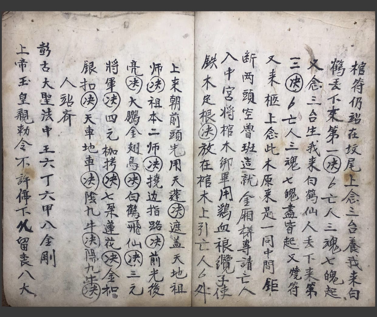 内容包括:包含:净口咒、解秽咒、十帅咒、殷帅咒、普庵咒、董仲咒、请南斗、白鹤符、取坟通用灵符、见骨烧、法师藏身部符、起棺符、起棺木亡人符、师人代符、烧符念天坑咒、孝家代大事用、孝家代符、退古墓符、退山家、解整丧邪法、书符口诀、五雷咒、压煞灵符、掩丧臭气秘咒、藏身咒、收魂咒、嗣灵先生传师忌秘旨、变尸法语、重丧吉语、重丧致语、掩重丧秘咒、掩雌雄藏身煞、藏身秘旨、变丧咒、挚鸡咒、出丧致语、掩天坑符式、天坑符、封丧符、斩草符、藏身符、掩重丧符、小鬼符、太岁符、灭门煞、独脚天坑、师人煞、师人天坑、土府煞等。