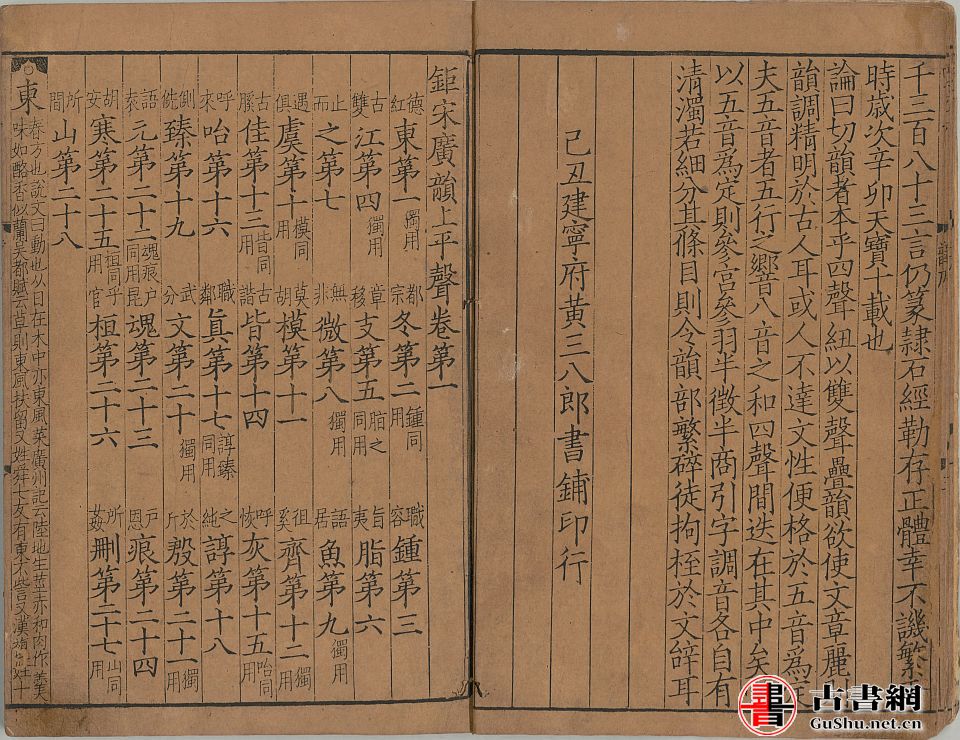 古籍.钜宋广韵.五卷.宋.陈彭年等撰.南宋乾道五年建宁府黄三八郎刻本